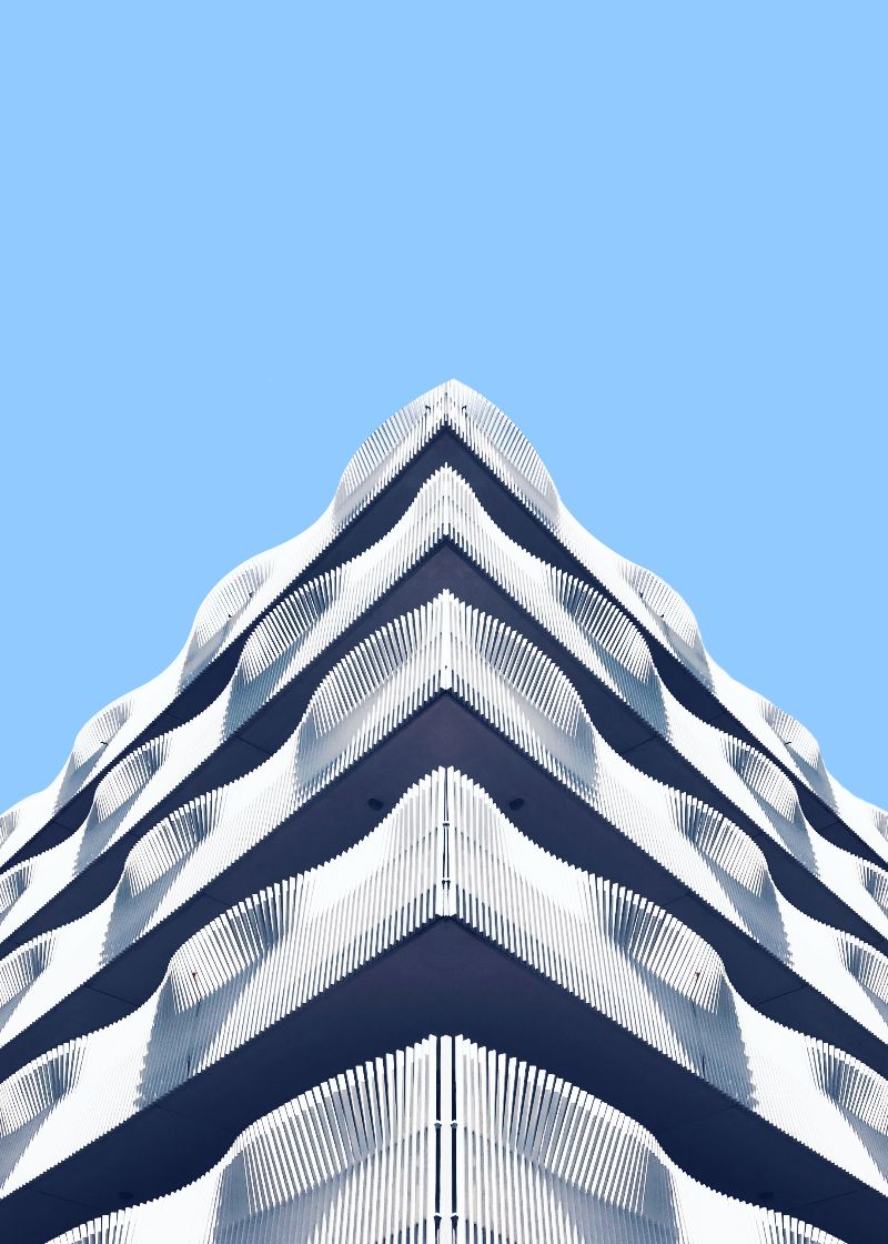 Linhas que dançam no céu azul, transformando concreto em arte geométrica.