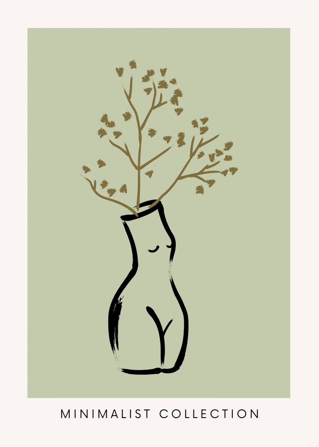 Um vaso minimalista em forma de corpo feminino, de onde brotam galhos delicados. Fundo verde suave que reforça o contraste entre força e delicadeza.