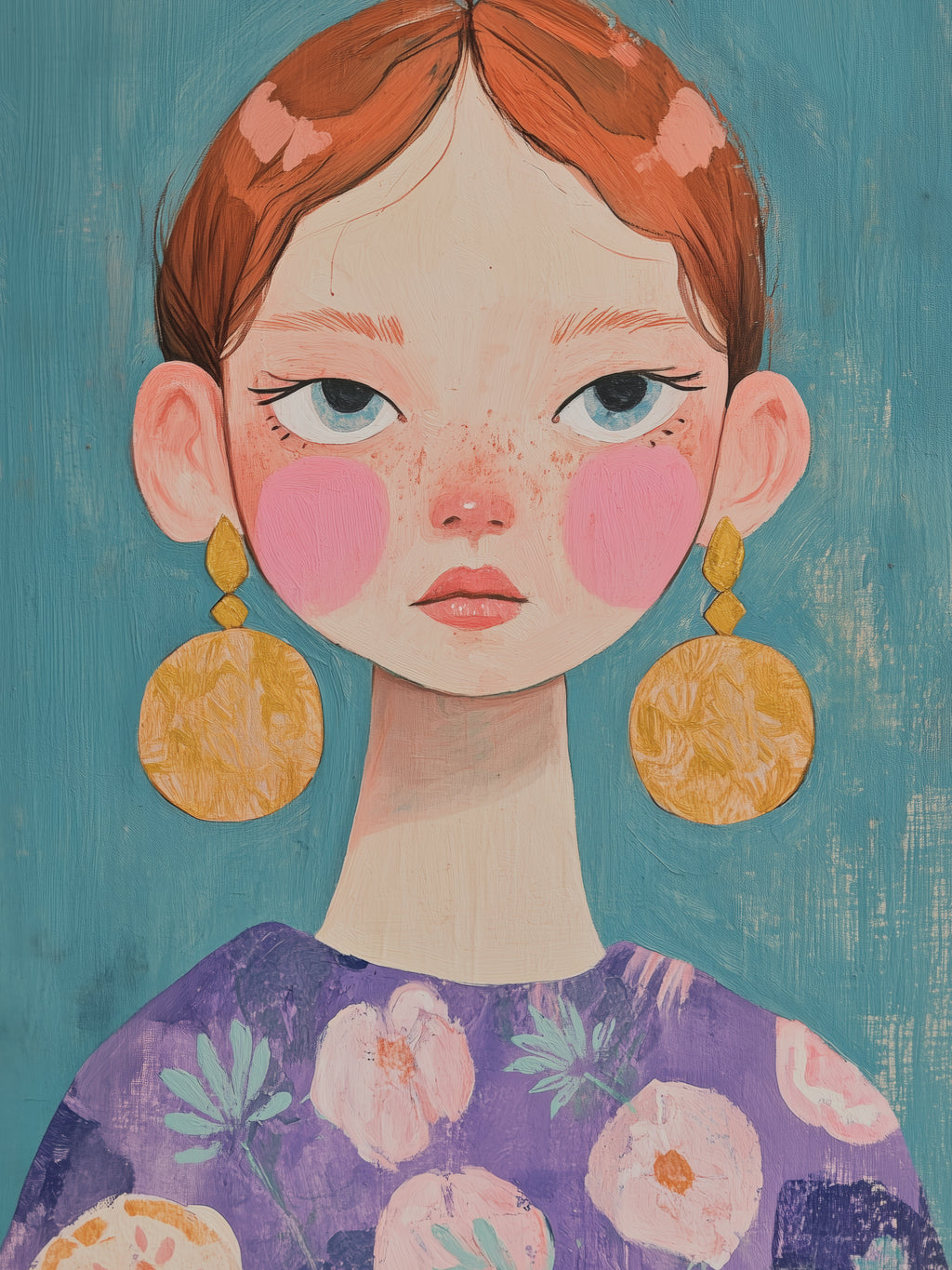Figura feminina de olhar sereno, adornada por brincos dourados, veste-se de flores lilases. Uma cena que mistura inocência e intensidade.
