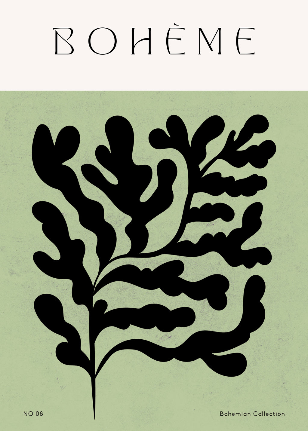 Silhueta botânica preta sobre fundo verde texturizado, com tipografia clássica. Uma obra que traz a estética francesa boho minimal.