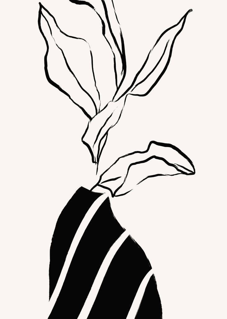 Folhas desenhadas em traços marcantes brotam de um vaso listrado. Minimalista e elegante, é um retrato do essencial, que une simplicidade e sofisticação.