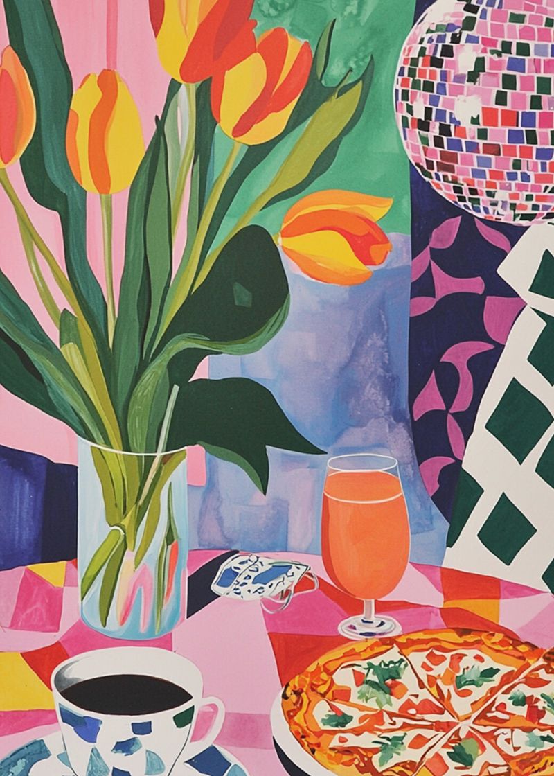Flores, cores e uma mesa convidativa que celebra os pequenos prazeres – café, pizza, flores e boa companhia.
