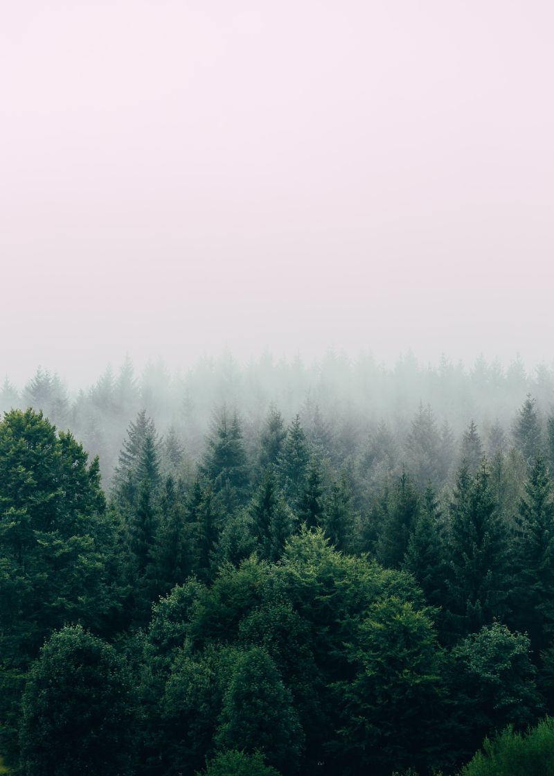 O nevoeiro envolve a floresta em um véu etéreo, criando uma atmosfera de mistério e contemplação.