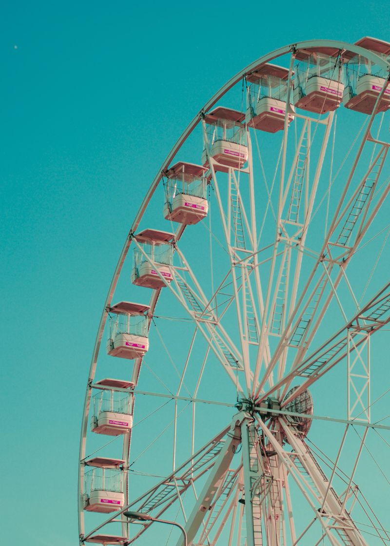 Uma roda-gigante iluminada contra o céu azul desperta memórias de infância e instantes de leveza.