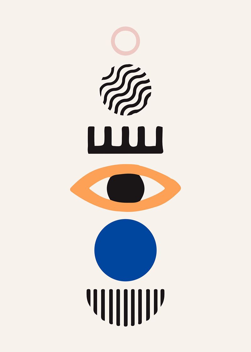 Arte moderna composta por elementos geométricos e gráficos – círculos, linhas e um olho central, criando um equilíbrio entre o orgânico e o matemático, transmitindo mistério e simbolismo visual.