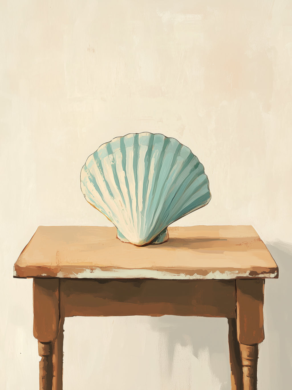 Uma concha azul clara repousa sobre mesa rústica em madeira. A obra evoca memória, mar e contemplação, em traço delicado e nostálgico.