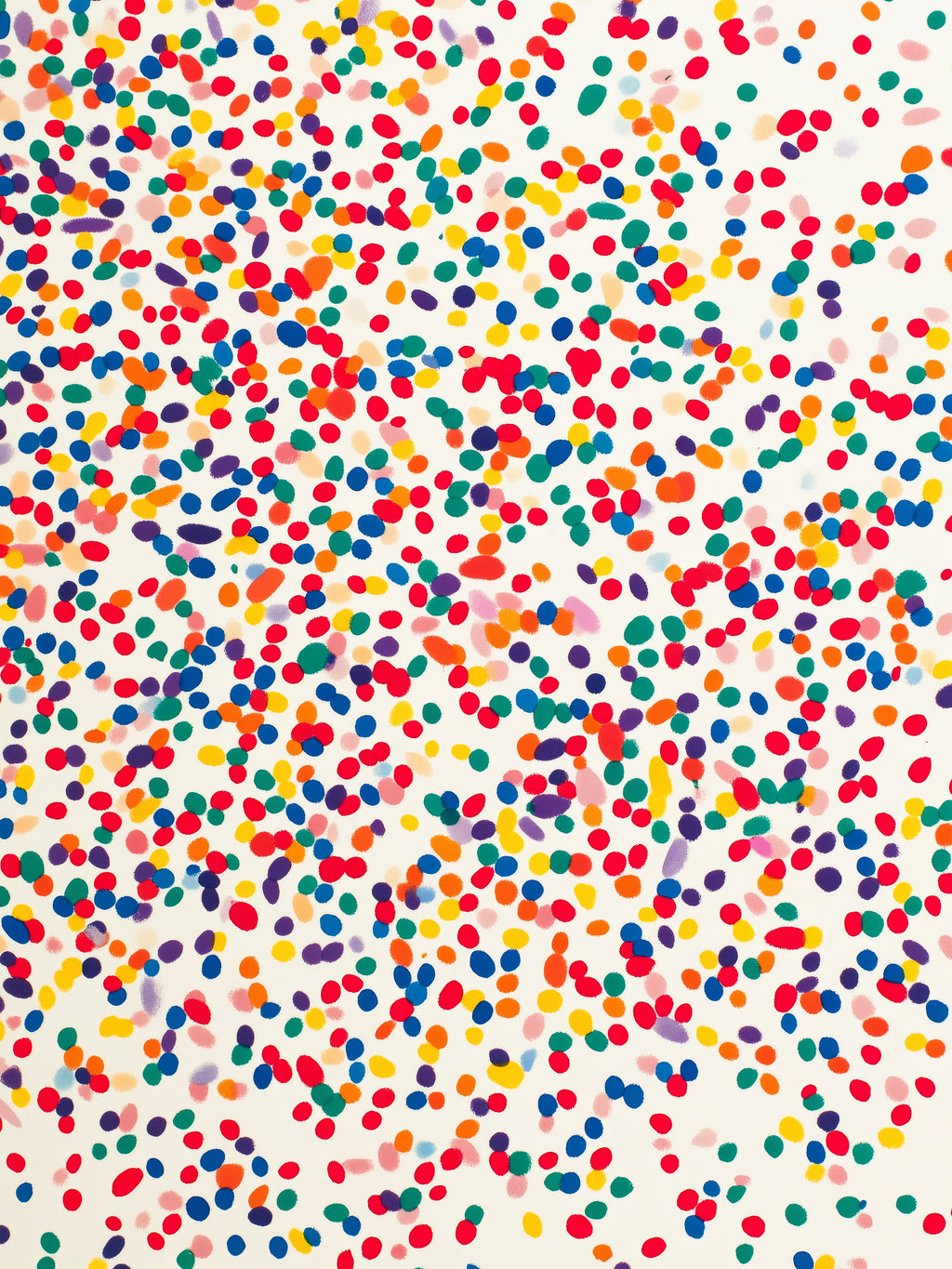 Centenas de pontos multicoloridos se espalham pelo fundo branco, como explosão de celebração. Uma obra que transmite energia vibrante e leveza.