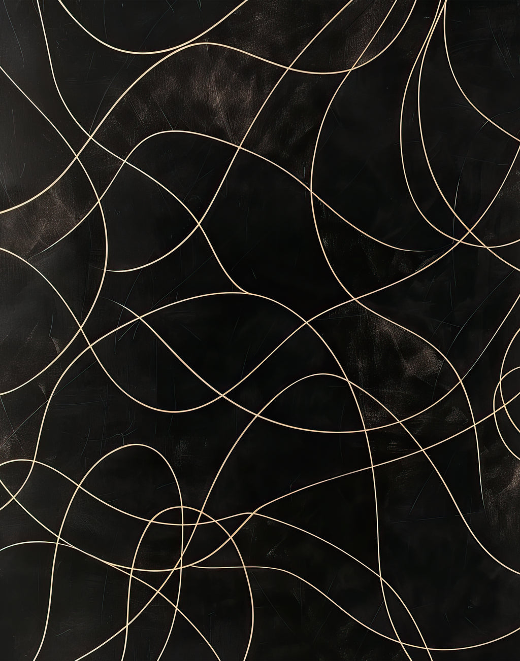 Linhas douradas se entrelaçam sobre um fundo negro profundo, como constelações em movimento. “Constelação Urbana” é enigmático e elegante, ideal para decorações sofisticadas e cosmopolitas.