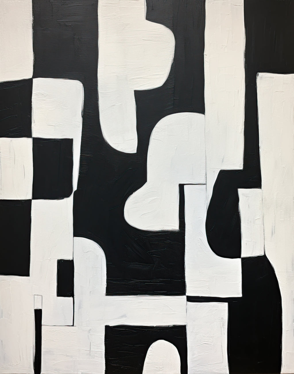 Blocos pretos e brancos se sobrepõem em um desenho geométrico ousado. “Contraste Vivo” é forte, moderno e impactante — perfeito para espaços que valorizam arte como presença marcante.