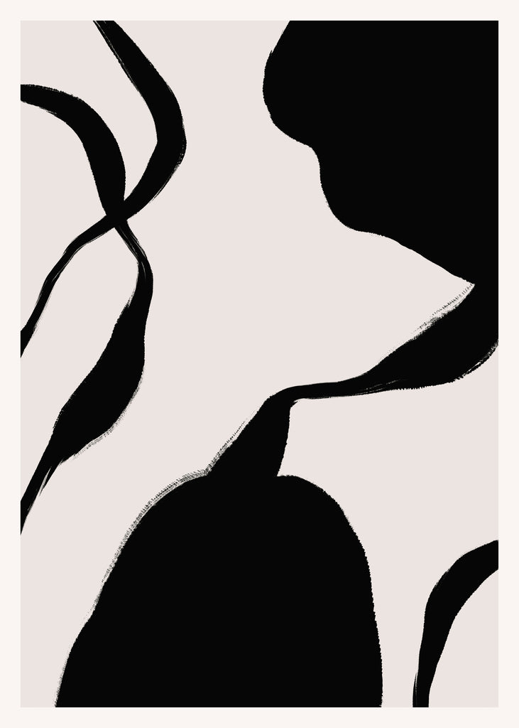 Pinceladas em preto sobre fundo claro formam um desenho abstrato de linhas fluidas e naturais. Uma peça que equilibra força e suavidade.