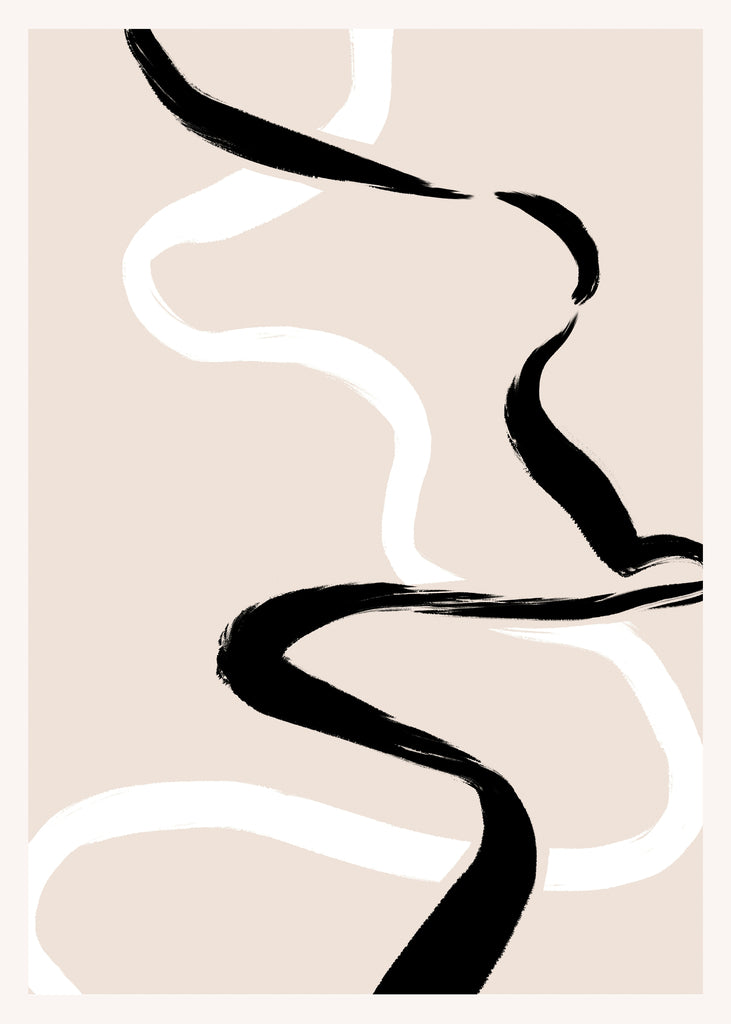 Pinceladas em preto sobre fundo claro formam um desenho abstrato de linhas fluidas e naturais. Uma peça que equilibra força e suavidade.