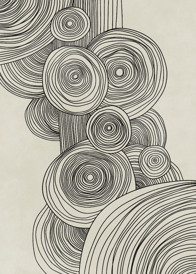 Linhas circulares que remetem aos anéis do tempo, trazendo a sensação de continuidade e conexão com a natureza.