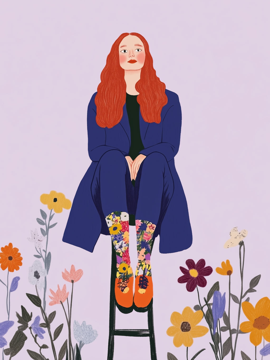 Mulher de cabelos ruivos veste casaco azul e botas florais, sentada entre flores coloridas. Uma composição que mistura atitude e delicadeza.