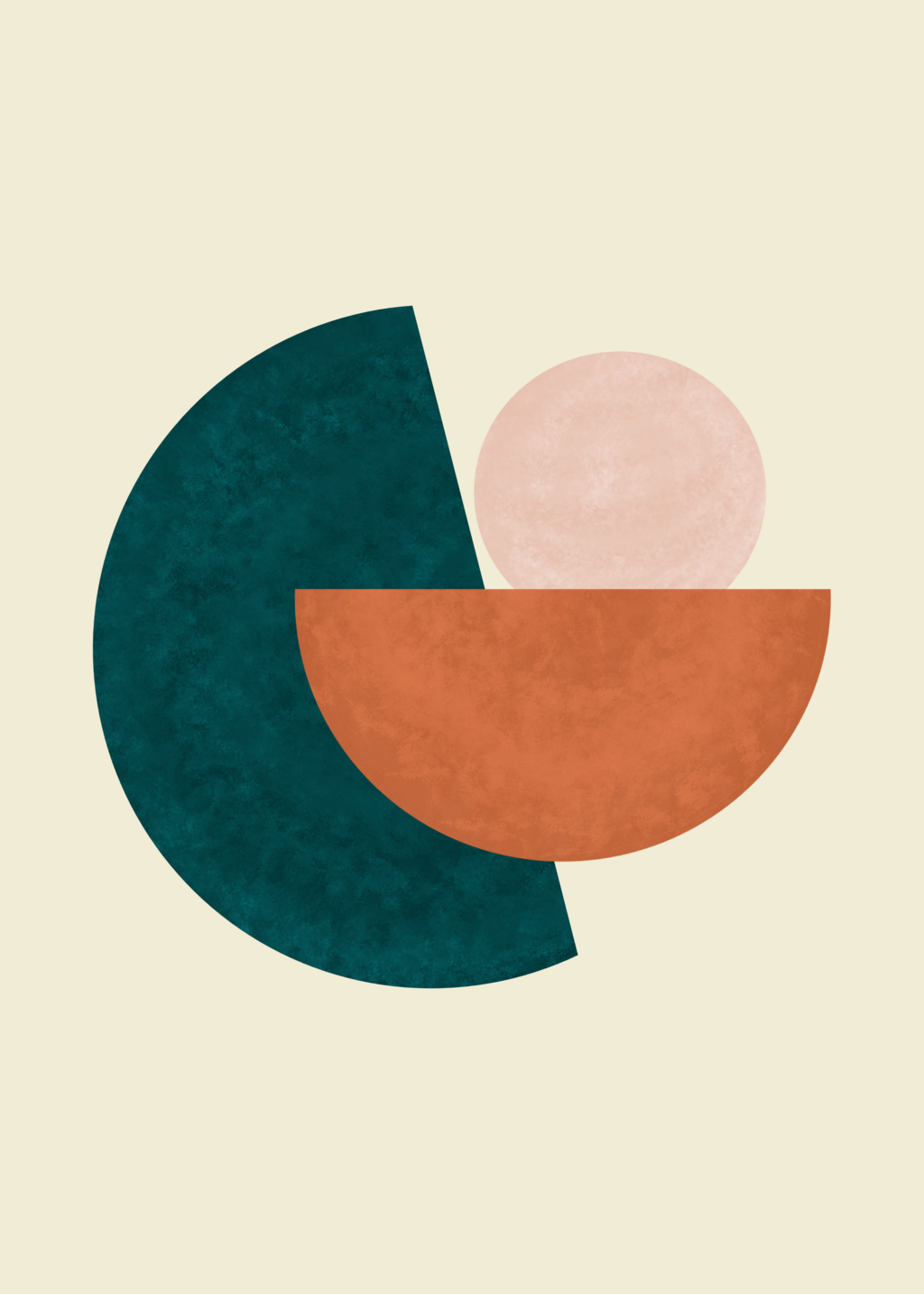 Semicírculos e círculos sobrepostos em verde, terracota e bege, criando um jogo visual de harmonia. Uma obra que fala de ordem e simplicidade.