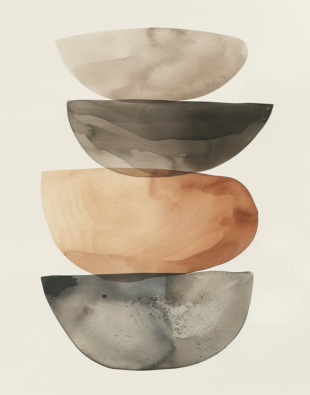 Formas simples, sobrepostas em camadas, sugerem estabilidade e serenidade em meio à imperfeição natural.