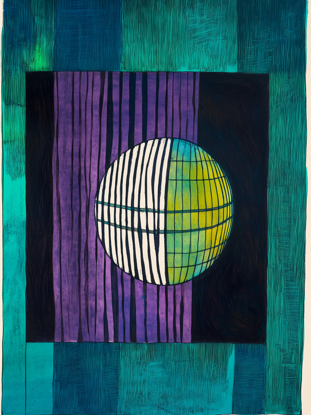 No centro da obra, uma esfera marcada por linhas verticais divide-se em tons de verde, roxo e preto. A geometria intensa dialoga com o fundo texturizado, evocando mistério e modernidade.