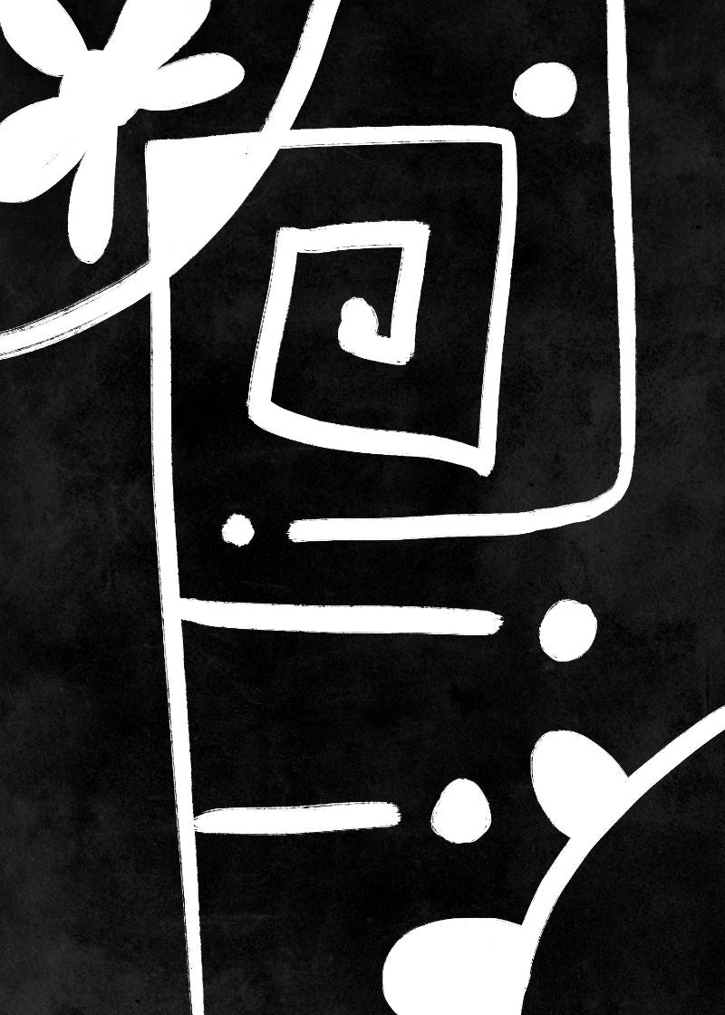 Linhas que remetem a símbolos primitivos, como se contassem histórias gravadas em pedra. Força, tempo e eternidade.