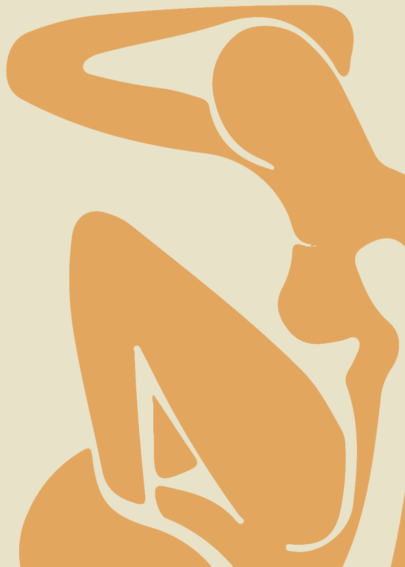 Silhueta abstrata em tons quentes que celebra a feminilidade e a energia vital do corpo em repouso.