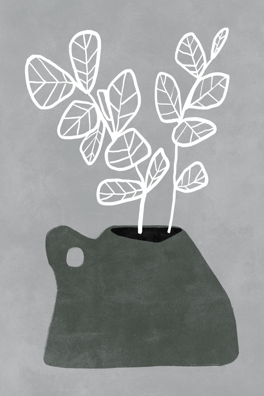 Galhos brancos em linhas finas emergem de um vaso sóbrio, como um sopro de calma. Uma arte que transmite paz, ideal para ambientes de introspecção.