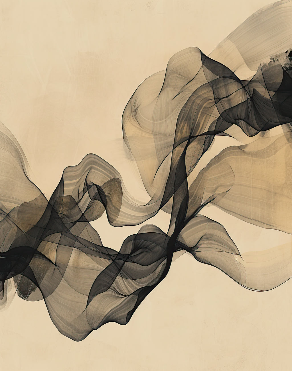Um movimento fluido e translúcido em preto atravessa o fundo neutro, lembrando tecidos flutuando ao vento. “Fluxo Etéreo” traz leveza e sofisticação, perfeito para espaços que pedem serenidade com um toque de mistério.