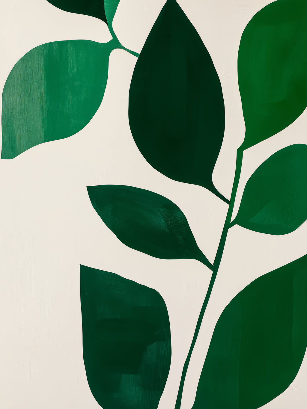 Grandes folhas verdes surgem sobre fundo claro em traços amplos e limpos. A obra traduz frescor e vitalidade de forma minimalista, perfeita para quem busca conexão direta com a natureza dentro de casa.