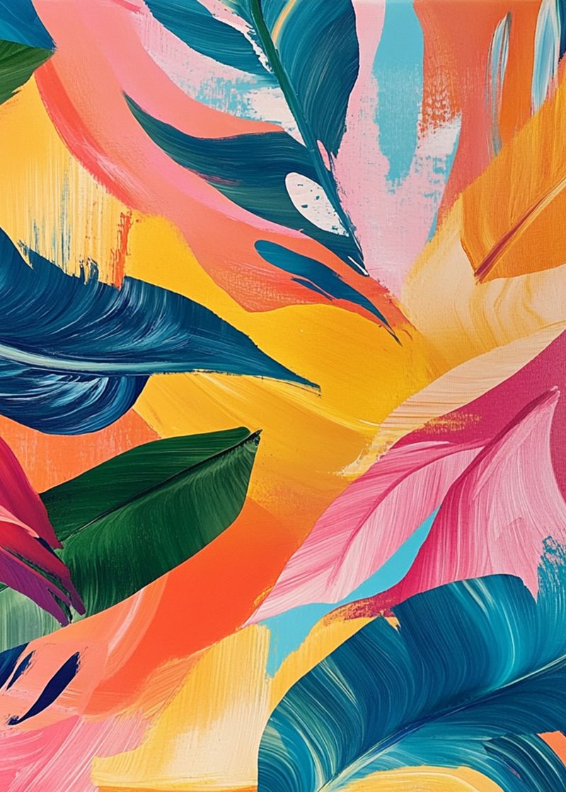 Um movimento de cores vivas que mistura tons quentes e frios. As folhas ganham vida em pinceladas fluidas e cheias de dinamismo.