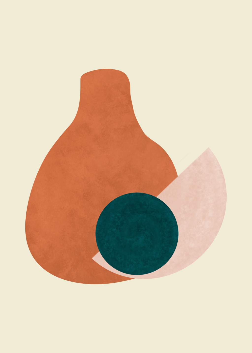 Um vaso abstrato em terracota se equilibra com formas geométricas em verde e bege. Uma composição serena, que equilibra o orgânico e o geométrico.