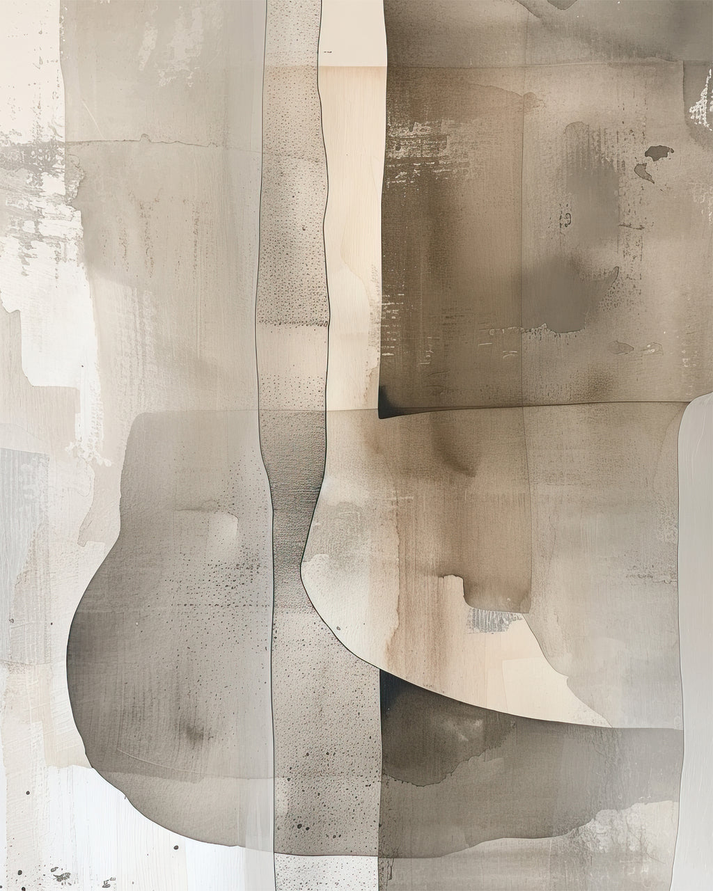 Sobreposições de texturas em bege e marrom criam camadas que parecem geológicas. Cada mancha se transforma em território, como se fosse um mapa abstrato. Uma obra terrosa, quente e acolhedora.