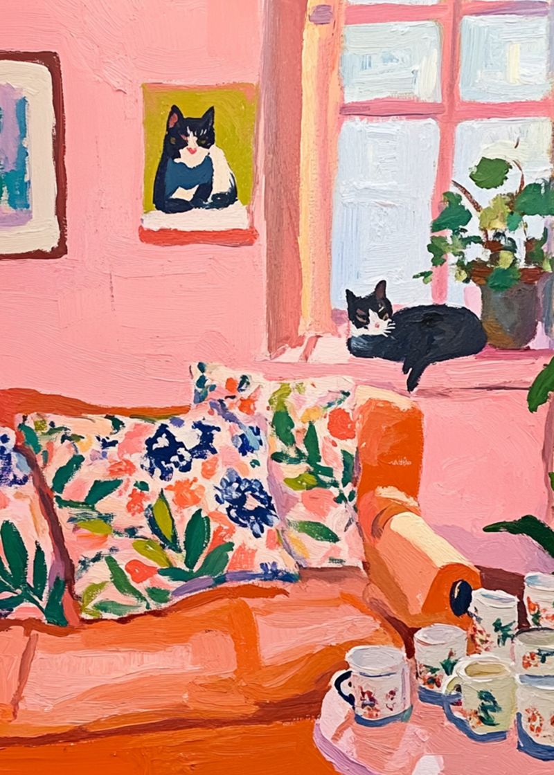 Cena intimista de um gatinho preto e branco descansando na janela de uma sala rosa decorada com almofadas florais. Um convite ao aconchego e tranquilidade.