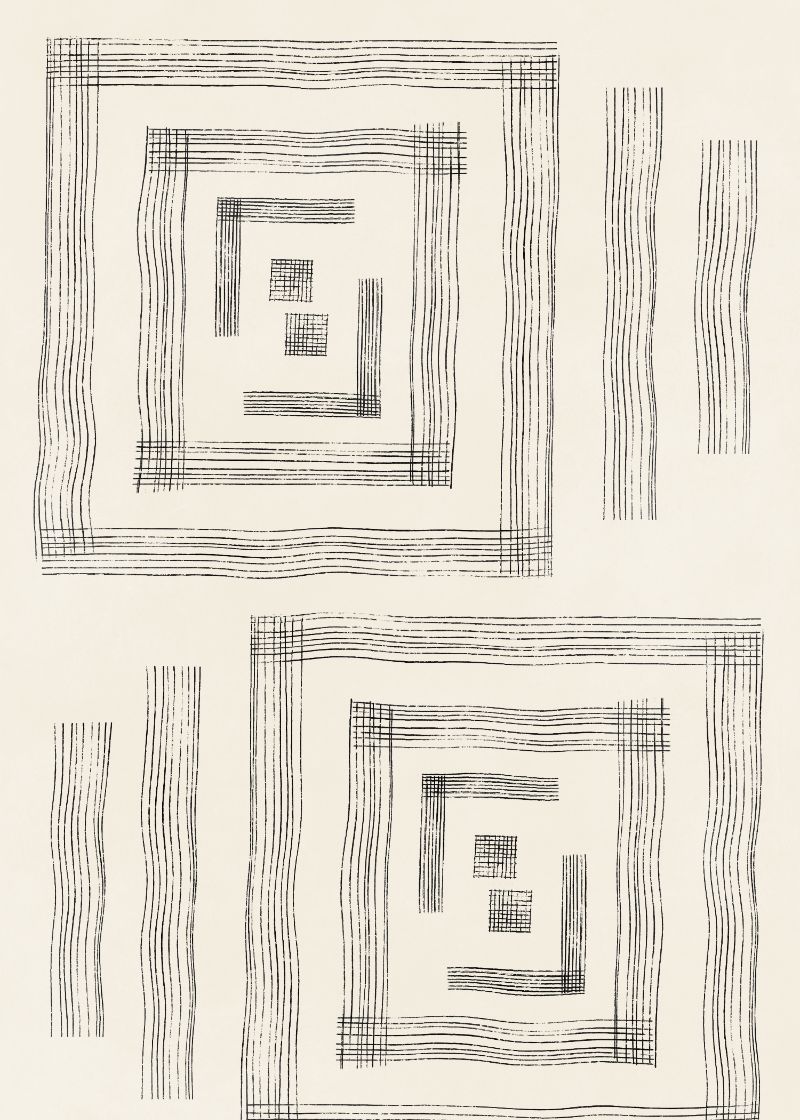 Formas quadradas que remetem a símbolos primitivos, trazendo força e equilíbrio à composição.