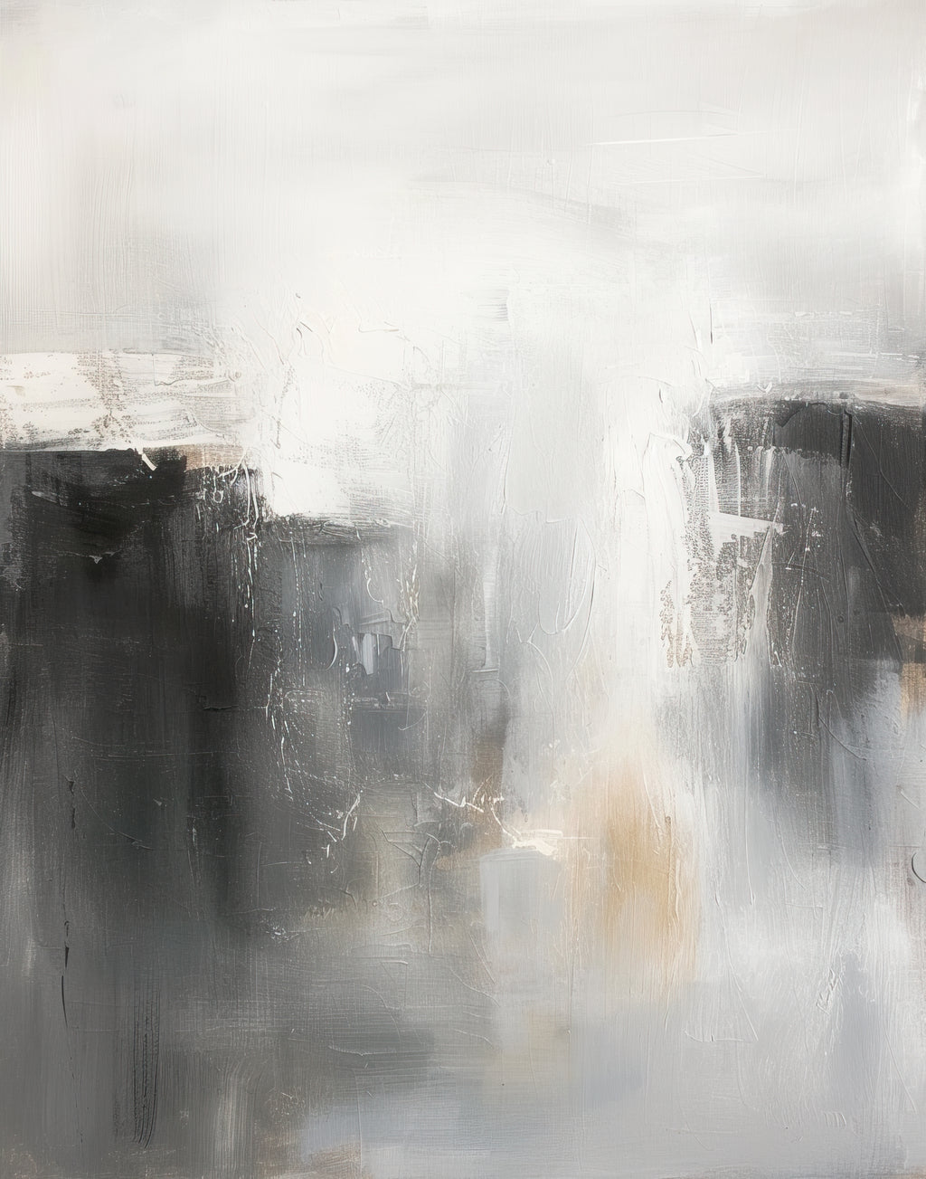 Texturas pesadas em preto, branco e bege remetem a paredes antigas, cheias de marcas do tempo. “Matéria e Memória” fala sobre permanência, camadas de história que resistem. Uma peça robusta e carregada de significado.