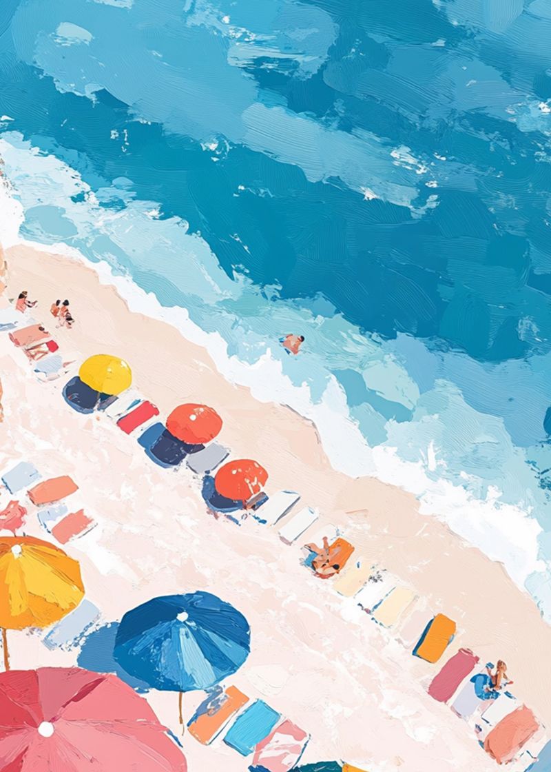 A vista aérea do mar e da areia em contraste com guarda-sóis coloridos, trazendo frescor e leveza.