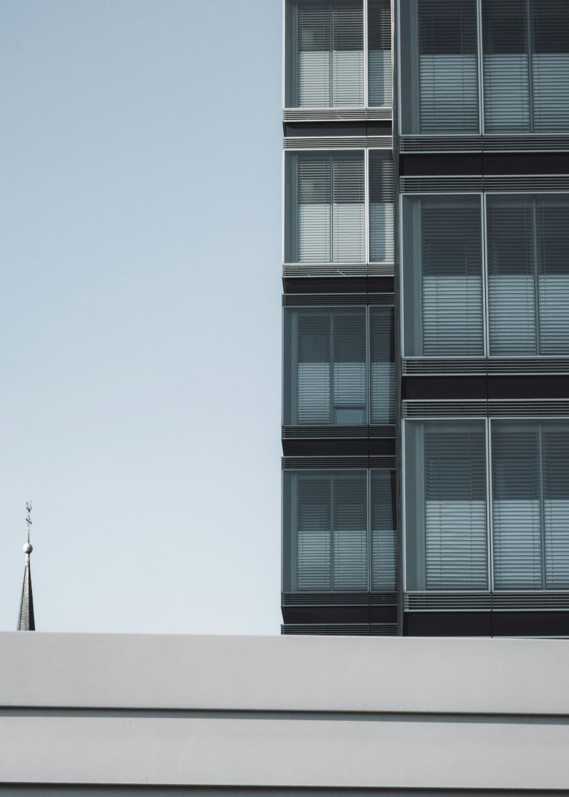 Linhas de vidro e aço que se encontram em perspectiva perfeita, destacando a força e a modernidade da arquitetura.
