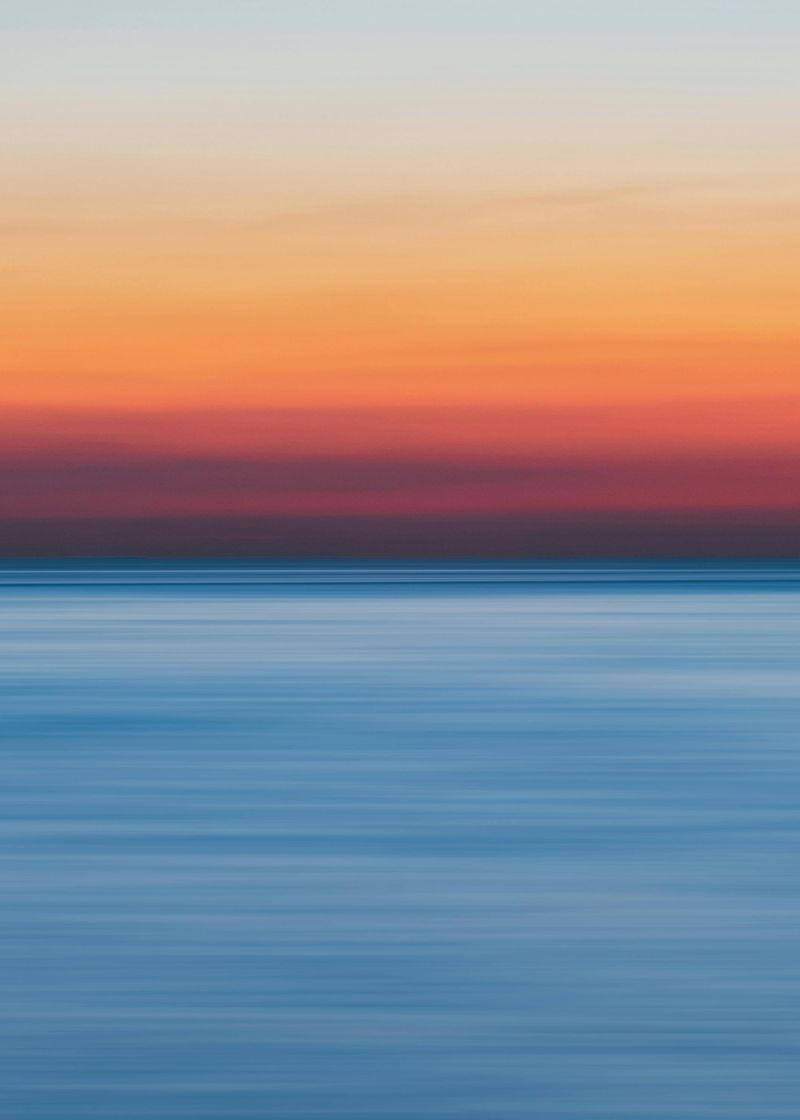 Uma paisagem minimalista mostrando o encontro do mar com o céu ao pôr do sol. As faixas de cores que vão do azul ao laranja criam uma atmosfera serena e contemplativa.