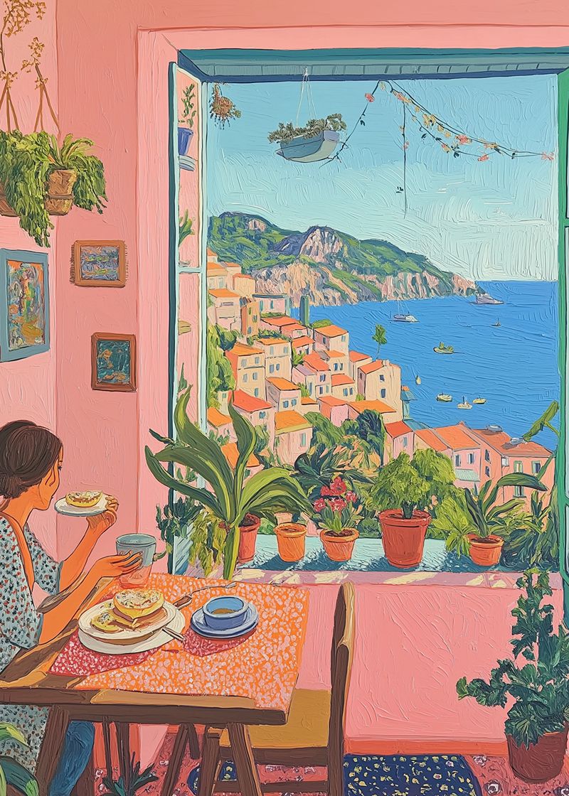 Um café tranquilo diante de uma vista mediterrânea, onde a arquitetura encontra o mar em perfeita harmonia