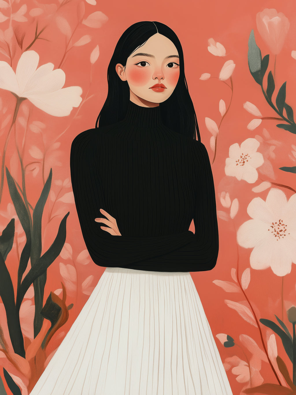 Mulher de expressão firme veste blusa preta e saia branca, cercada por flores em fundo coral. A obra une serenidade e poder feminino.