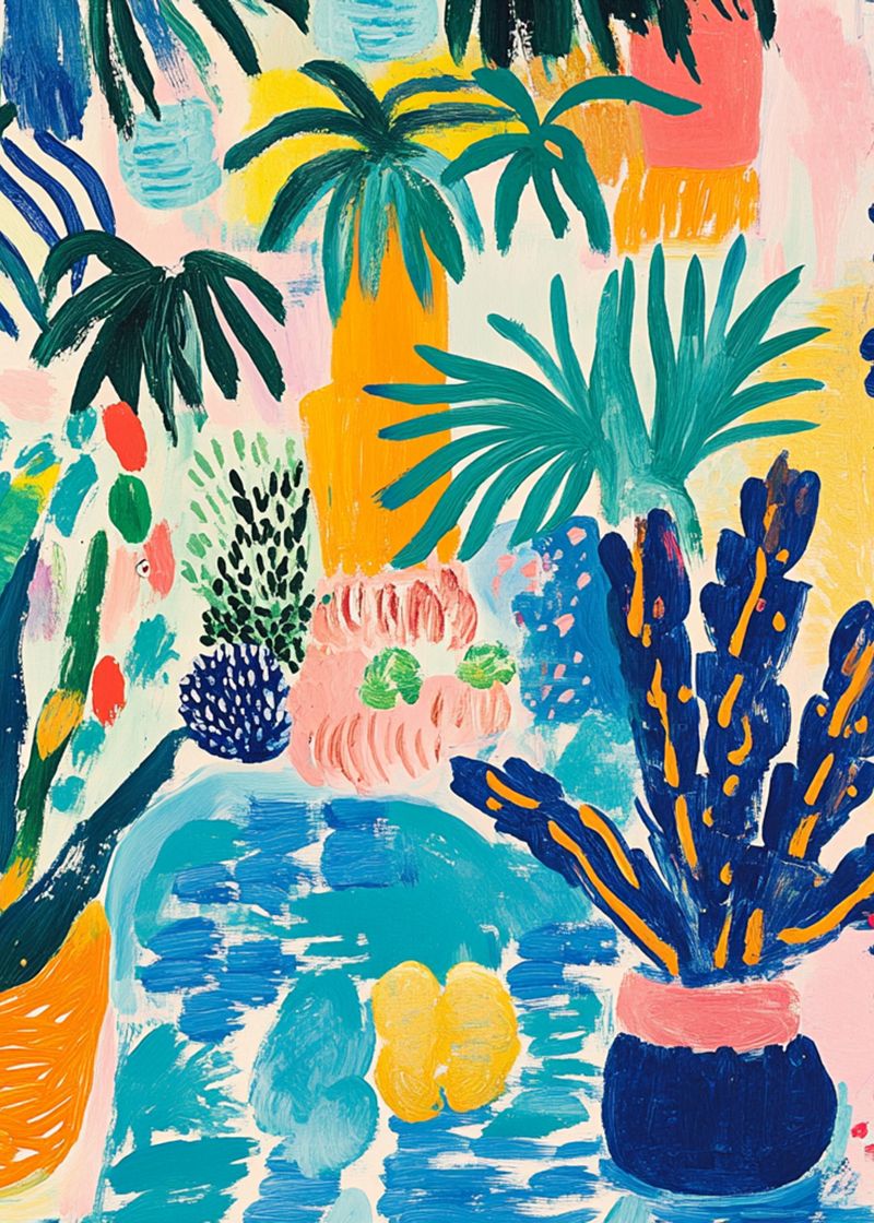 Uma explosão de cores tropicais e pinceladas soltas que remetem a um jardim vibrante. Energia, leveza e espontaneidade se encontram nesta obra.