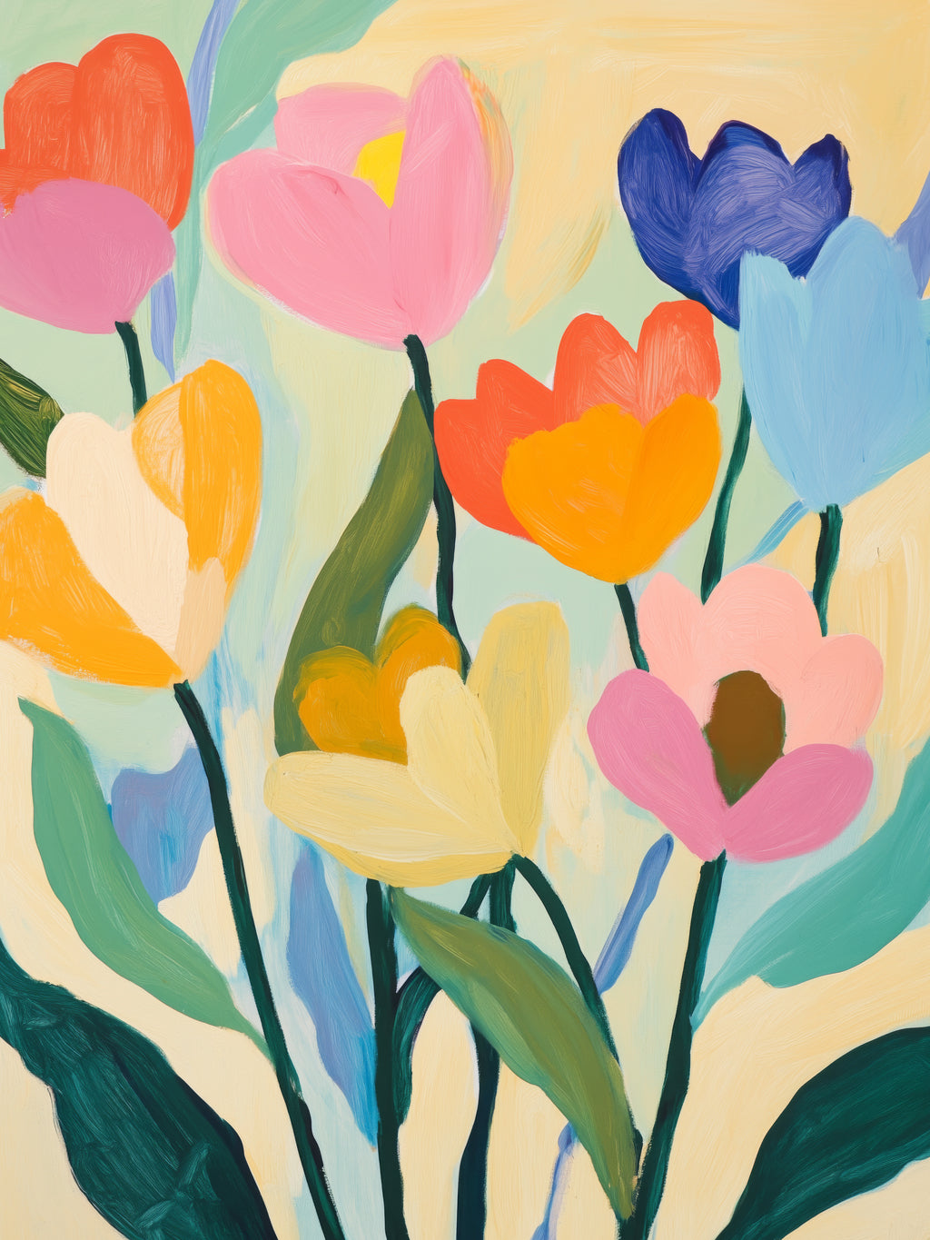 Flores em cores vibrantes — rosa, laranja, amarelo, azul e lilás — se erguem como um coro de celebração. Cada pétala carrega a energia da primavera e transmite frescor, leveza e vida. Uma obra perfeita para ambientes que pedem positividade e luminosidade.