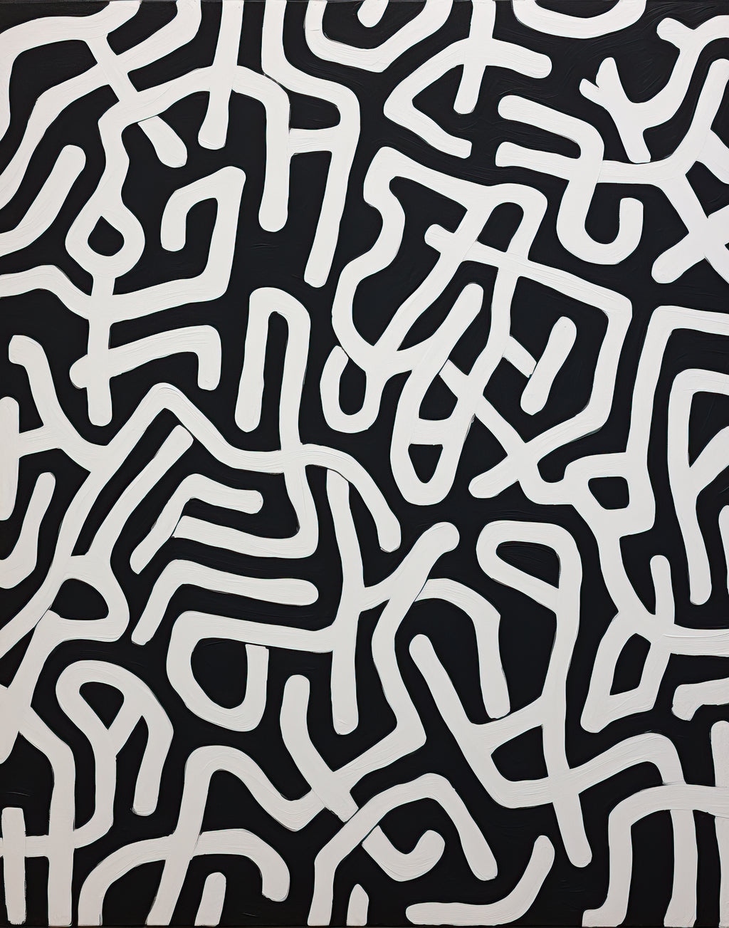 Linhas brancas sinuosas sobre fundo preto criam um emaranhado quase hipnótico. A obra convida o olhar a se perder e encontrar novos caminhos a cada observação. Moderna e ousada, dá um toque urbano e contemporâneo.
