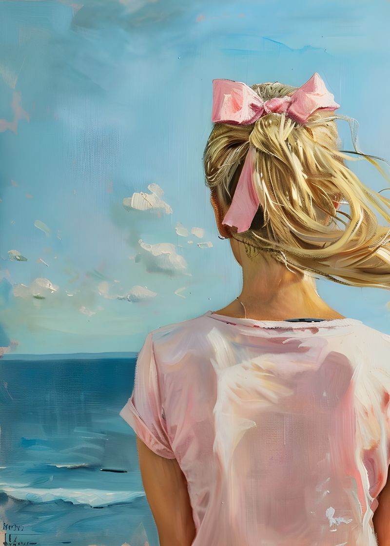 Uma jovem observa o mar com serenidade. O laço rosa no cabelo contrasta delicadamente com o azul do oceano, simbolizando leveza e contemplação.