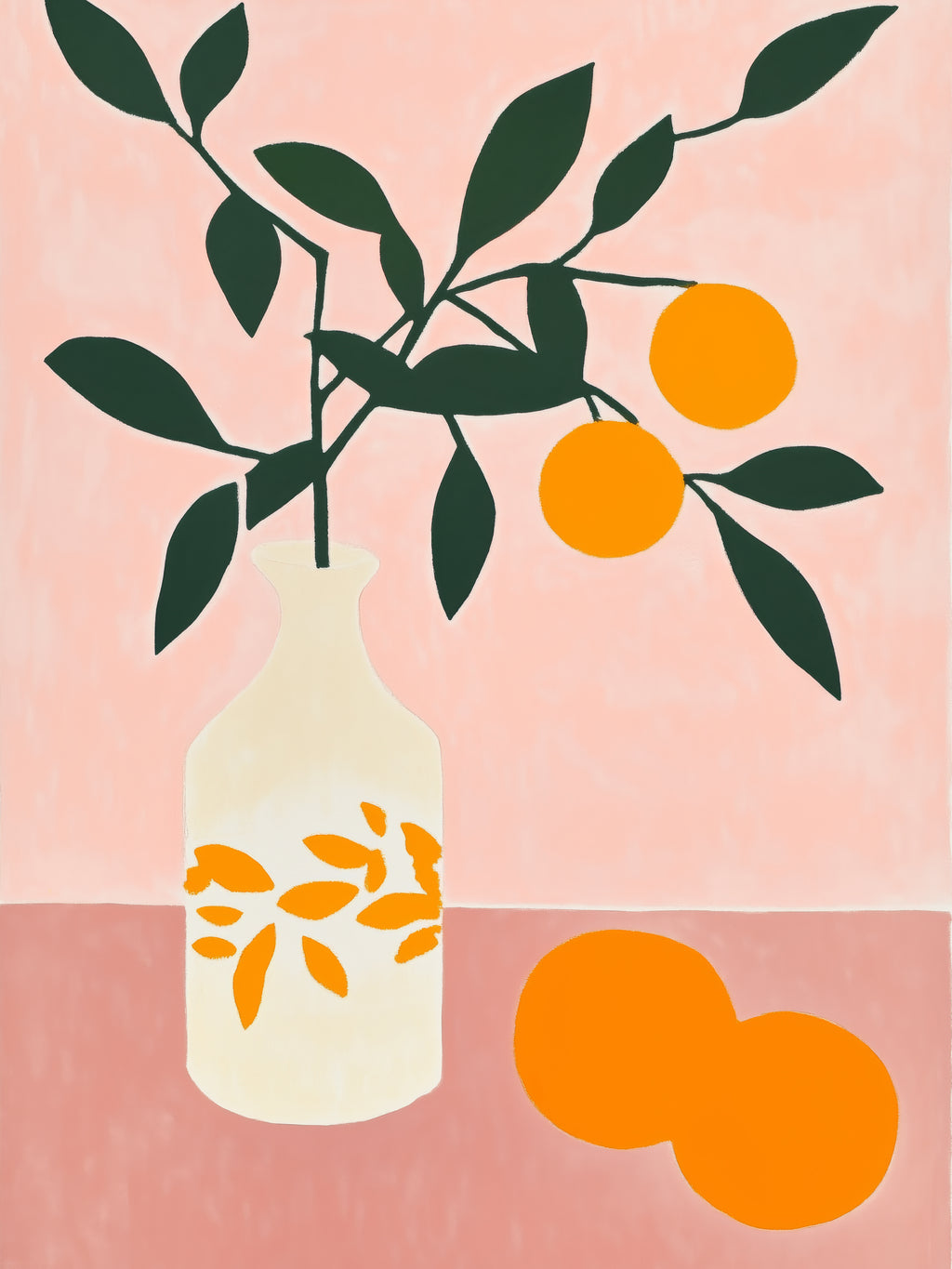 Um vaso branco recebe galhos de laranjeira, onde folhas verdes intensas e frutos alaranjados se destacam. Minimalista e vibrante, a obra transmite frescor e autenticidade, trazendo vida e energia a qualquer espaço.