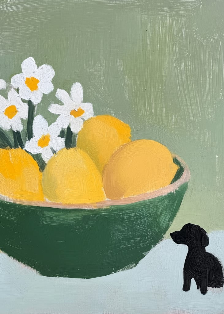 Tigela verde com limões amarelos e margaridas brancas contrasta com pequeno cão em silhueta. Um instante de alegria singela e acolhedora.