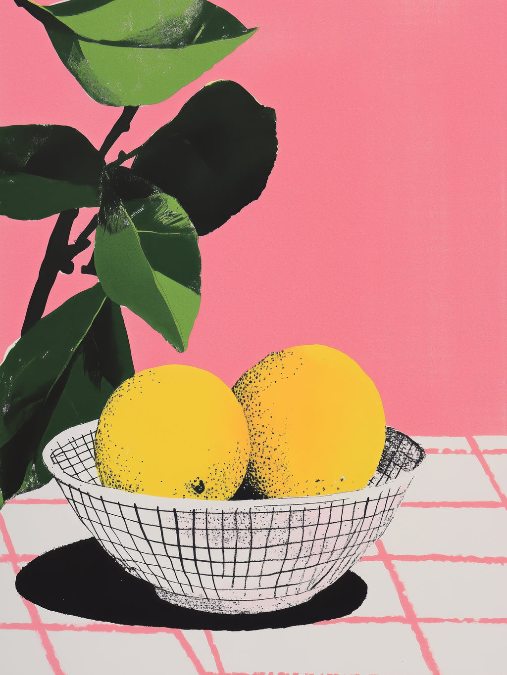 Dois limões amarelos em cesto branco se destacam contra fundo rosa intenso. A simplicidade do cotidiano ganha energia pop.