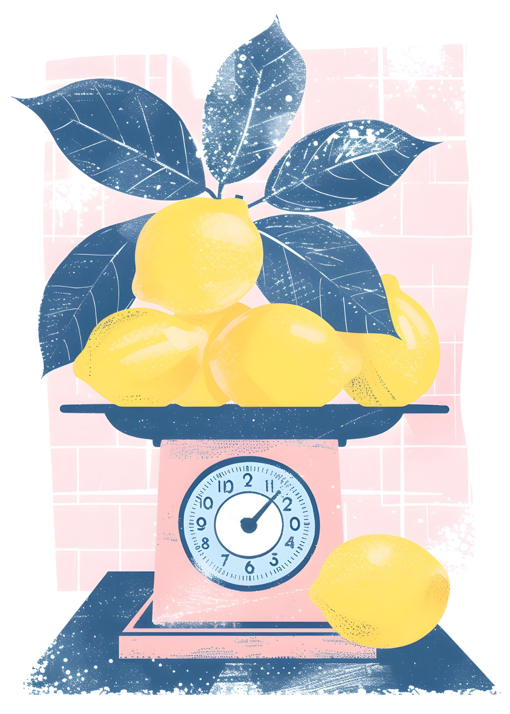 Frutos amarelos repousam sobre uma balança retrô cor-de-rosa, cercados por folhas azuis. A obra traz simplicidade charmosa e memória afetiva da cozinha caseira.