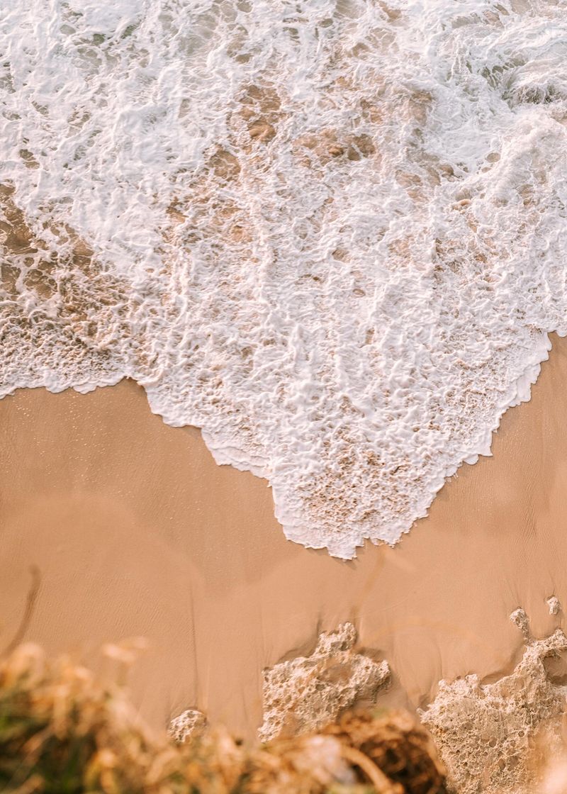 A espuma das ondas beija a areia em texturas delicadas e efêmeras.