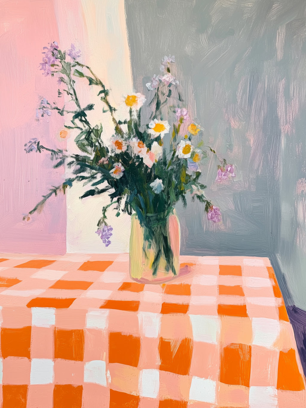 Um arranjo delicado de flores silvestres repousa sobre mesa xadrez em tons de laranja e rosa. A obra captura o encanto da simplicidade e a beleza dos detalhes do dia a dia.