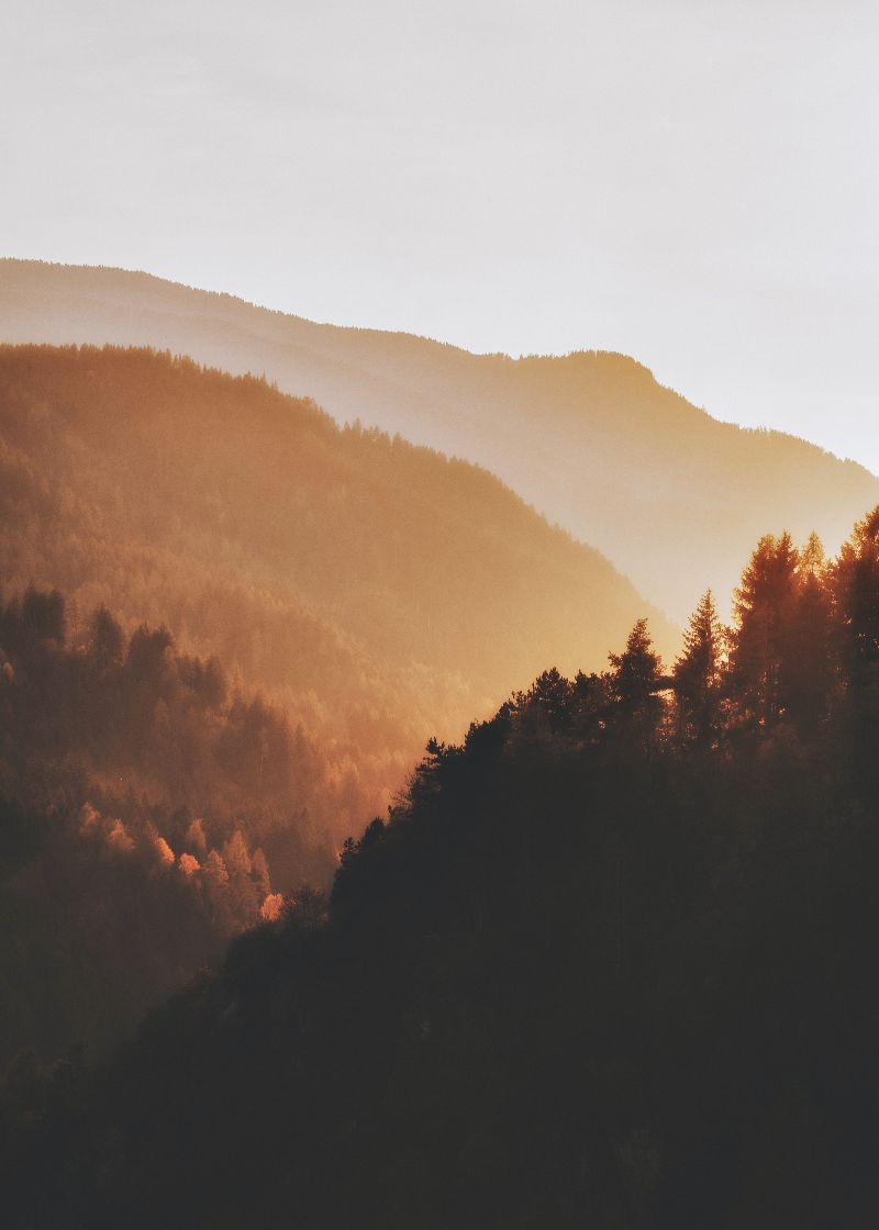 A luz suave do entardecer envolve as montanhas em tons de ouro, como um abraço caloroso da natureza.