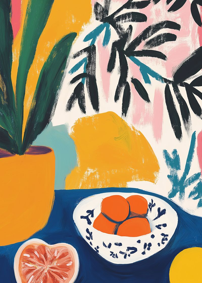 Estilo moderno e descontraído, essa obra traz frutas cítricas em traços soltos e cores contrastantes, ideal para cozinhas ou espaços que pedem energia e frescor.