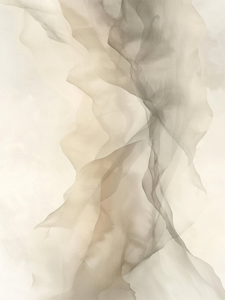 Transparências suaves se dobram em formas quase etéreas, lembrando tecidos ao vento ou paisagens enevoadas. A fluidez da composição transmite calma, paz interior e um sopro de serenidade.