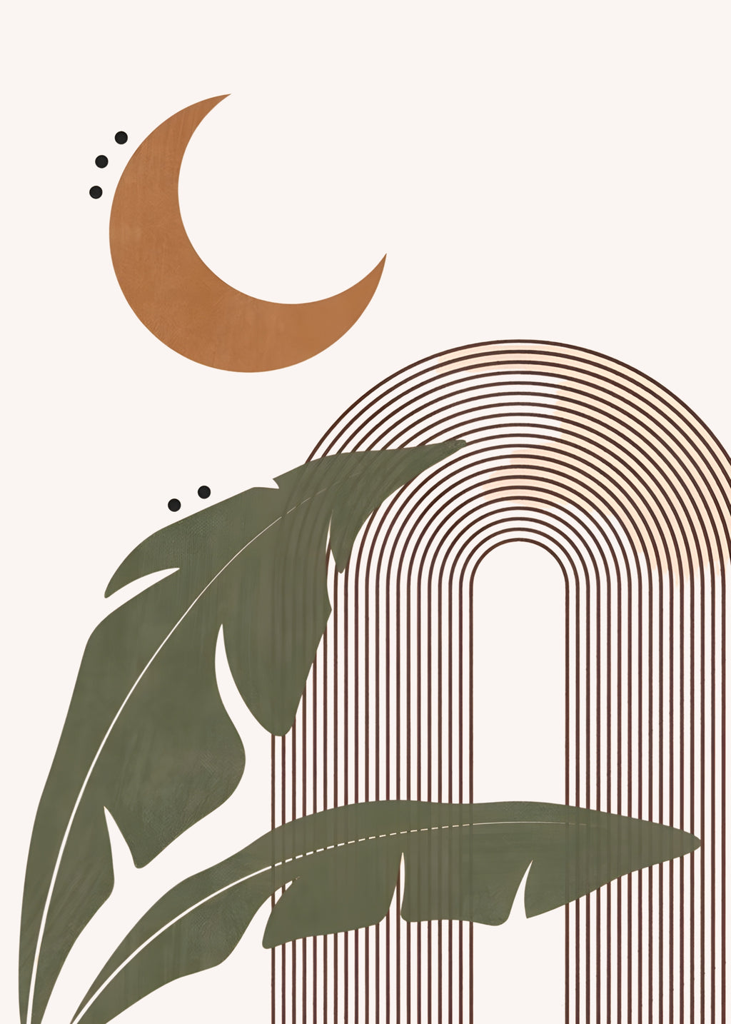 A lua crescente surge sobre folhas tropicais e linhas curvas em tom terroso. Uma obra que mistura mistério e calma, perfeita para criar uma atmosfera de refúgio noturno.